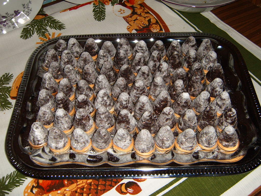 Smícháme piškoty, změklé máslo, cukr, kakao, oříšky, mléko a rum (místo mléka můžeme přidat víc rumu) a vypracujeme vláčné těsto. Z těsta uděláme vždy malou kuličku, kterou vtlačíme do formičky na úly a střed naplníme krémem. Celé potom přilepíme na piškot.